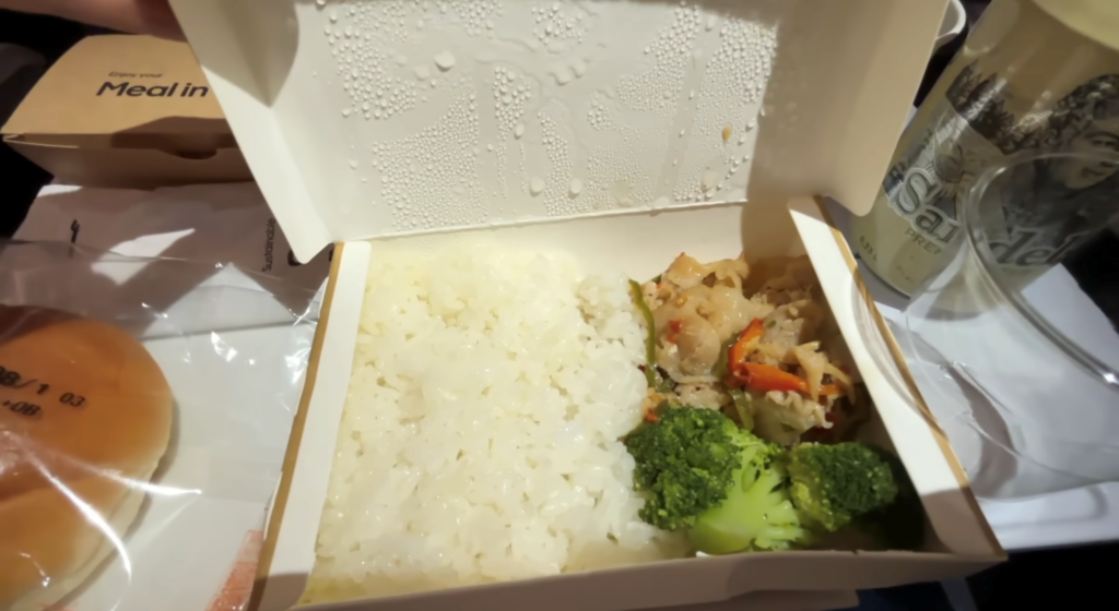1回目の夕食では、チキンか豚肉かを選べるスタイルでした。今回は「豚挽肉のタイバジル炒め(ガパオ風)」をチョイス。味付けは優しく、それでいて白米によく合う美味しさです。機内でいただく温かいご飯は、なんだか嬉しくなりますよね。