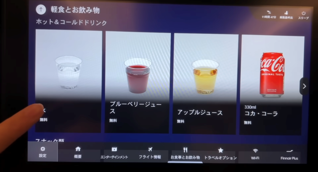 そして、フィンエアーでおすすめの飲み物といえば「ブルーベリージュース」です。甘すぎず、さっぱりとした後味。北欧の森の恵みを感じさせるような深い味わいは、一度飲むと忘れられません。「日本でも販売してほしいな」と思うほど美味しく、機内での水分補給にぴったりです。
