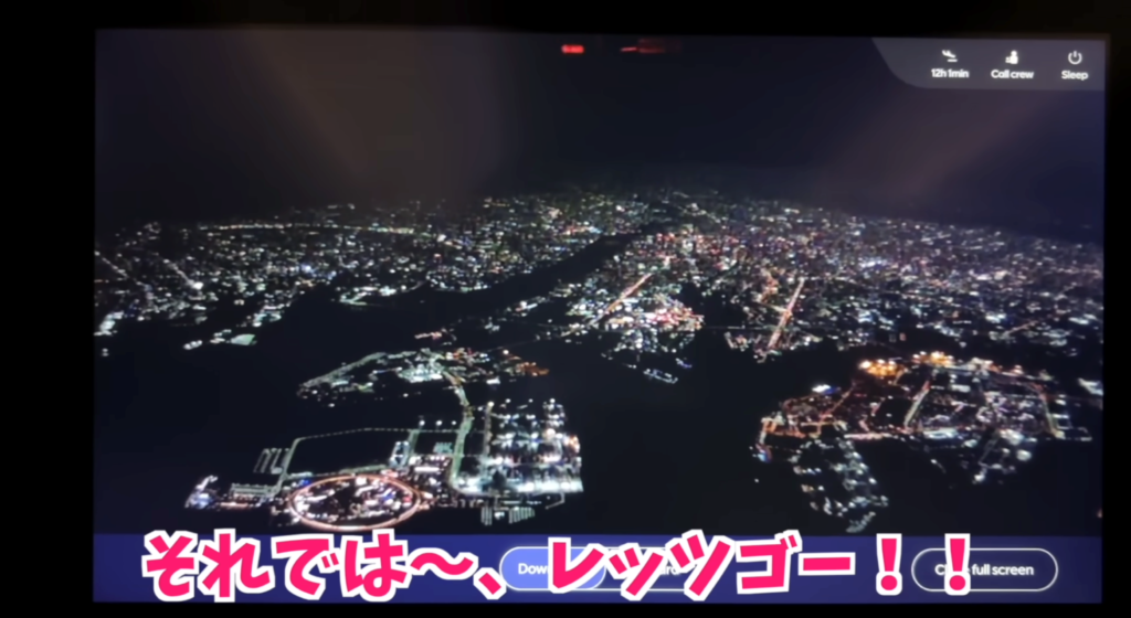 大阪の夜景を眼下に眺めながら、飛行機は高度を上げていきます。当時開催中の関西万博の「大屋根リング」が見えたときは、思わず胸が熱くなりました。