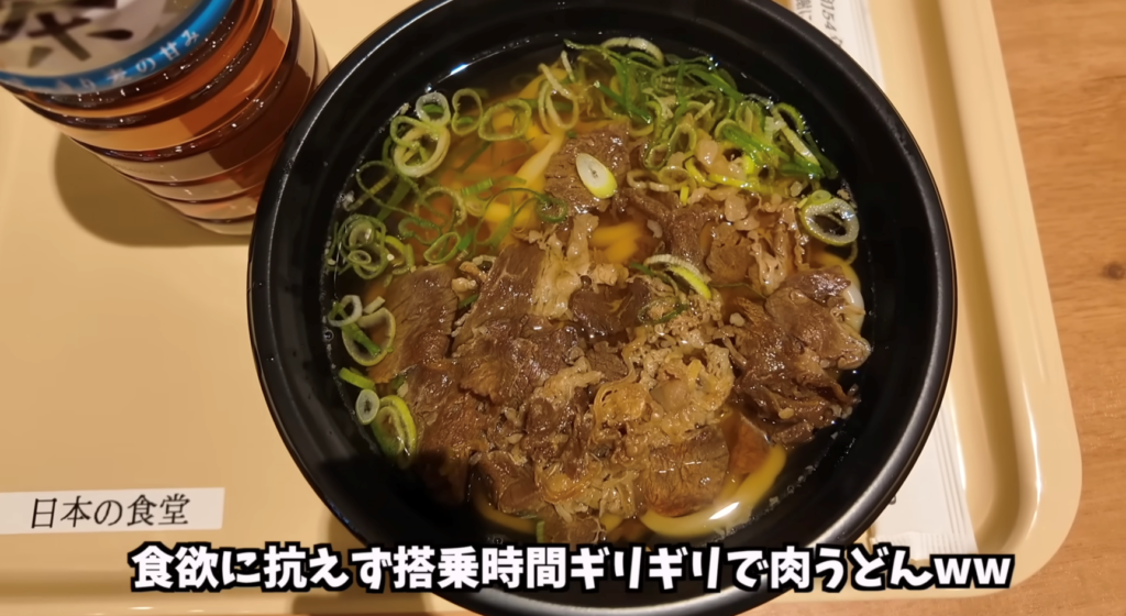 12時間半のロングフライトに備えて、まず出発前に温かい日本食をいただくことにしました。「これからしばらく、本物の日本食とはお別れなんだな」と思うと、いつもの肉うどんも格別に美味しく感じられます。しっかりエネルギーとお出汁をチャージして、搭乗ゲートへと向かいます。