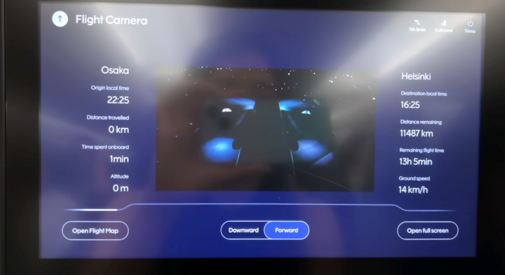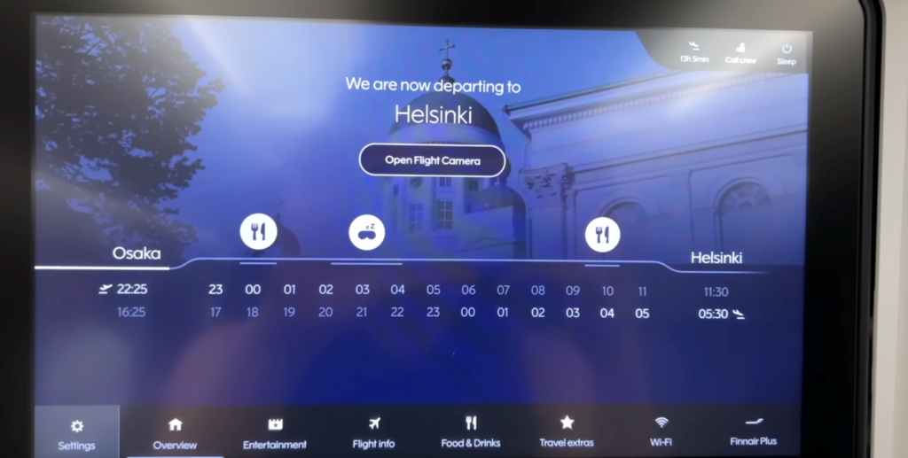 フィンエアーに乗ったら、まずモニターの「機外カメラ」をチェックしてみてください。尾翼に取り付けられたカメラからは、飛行機全体を俯瞰で見ることができ、足元のカメラからは滑走路の様子がリアルタイムで映し出されます。