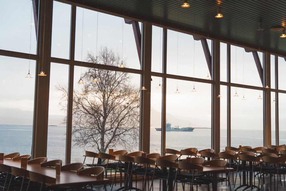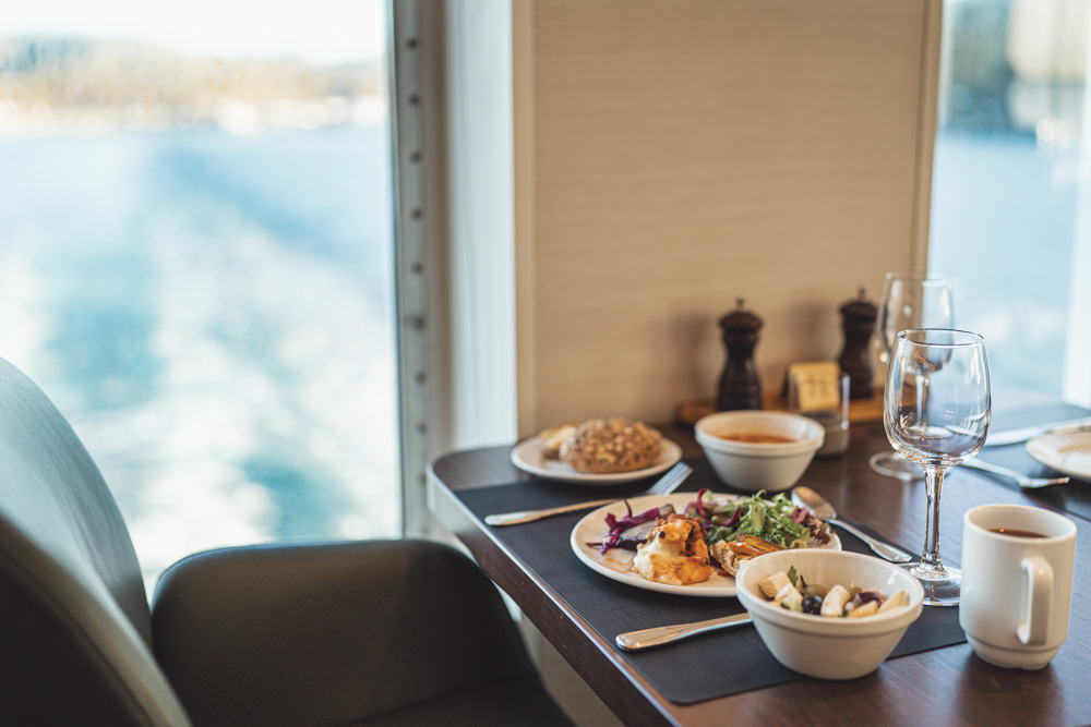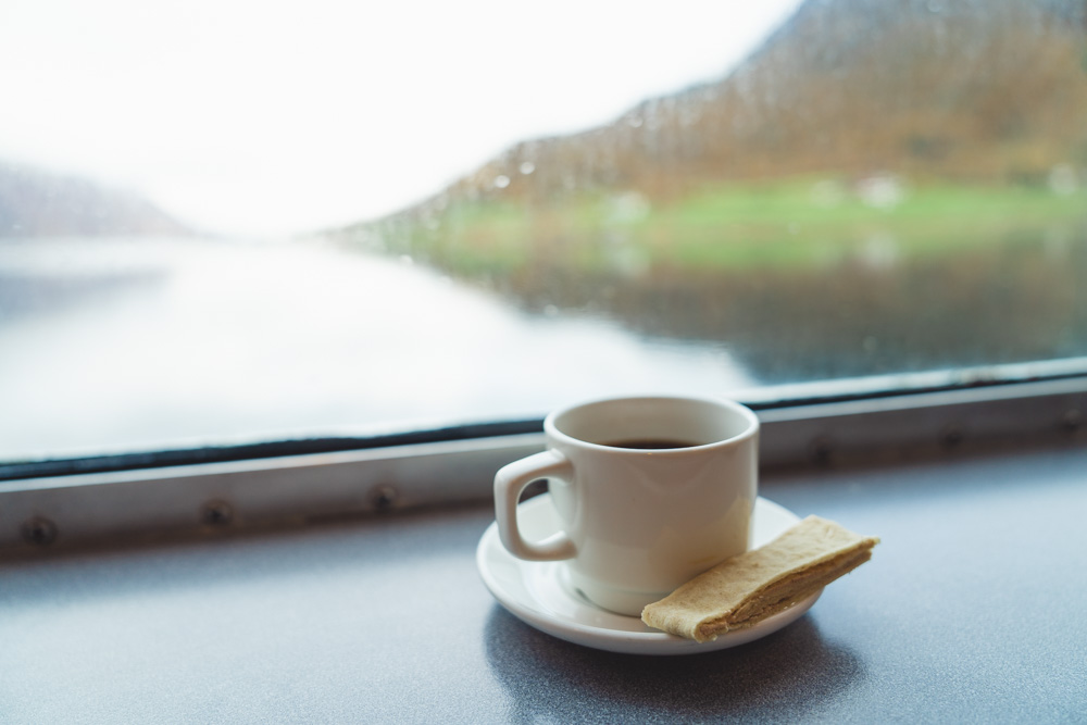 ギュレスフィヨルドでは小さなフェリーに乗り、ワッフルを楽しみながらティータイムも。