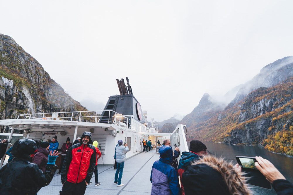 切り立ったフィヨルドが左右から次々と迫ってくる中、巧みに避けながら進んでいく船は、まるで海賊映画かファンタジー映画の世界に入り込んだかのようです!
