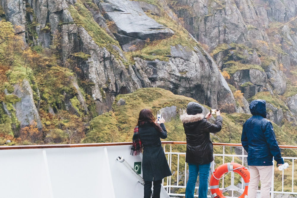 ですが南行きの見どころは寄港地よりも船上から見る絶景!これぞノルウェーといった航路屈指の大迫力の絶景スポットを昼間に間近にみられ、冒険気分満点の船旅が叶います。