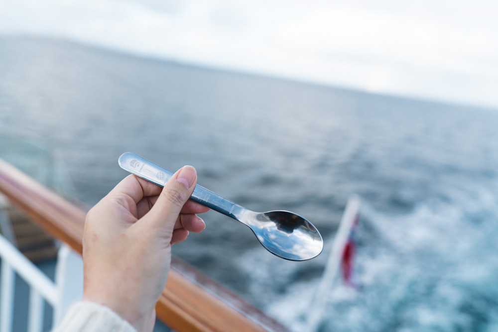 北行きの時は「北極圏突入」のイベントで、妖精のような格好をしたクルーに、おたま一杯の氷水を背中にふっかけられるという根性試しイベントでしたが、南行きの「北極圏脱出」は栄養満点のスプーン1杯のタラの肝油を振る舞ってくれる、お優しいイベント。