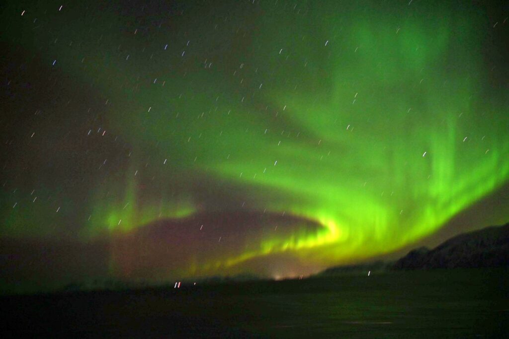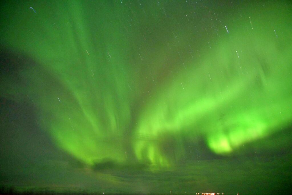 肉眼でも確認できる強いオーロラが見えて、まるで生き物のように動く姿は幻想的。