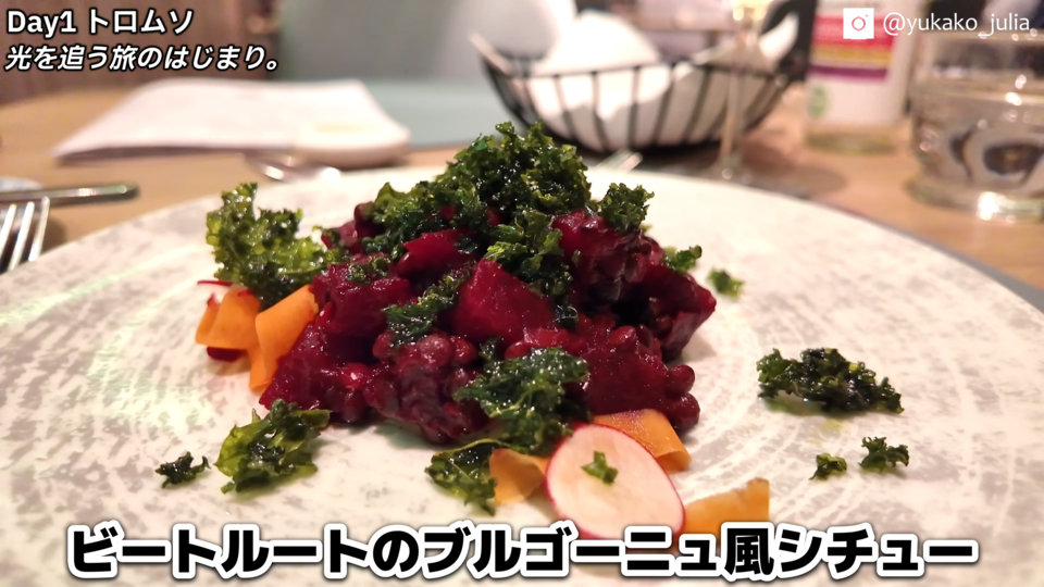 追加料金なしで利用できるもう一つのレストランが「Brasserie Árran(ブラッスリー・アーラン)」です。サーミの人々へのオマージュとして、トナカイ肉のシチューなど伝統的なサーミ料理をモダンなアレンジで提供しています。落ち着いた雰囲気の中で、毎日飽きることなく食事を楽しめました。