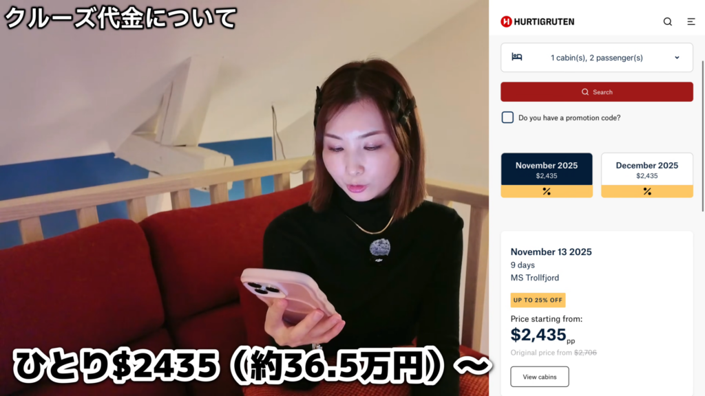 気になる費用ですが、2025年11月時点の参考価格で、オールインクルーシブ(食事・ドリンク・Wi-Fi込)9日間、1人あたり約2,435ドル〜となっています。