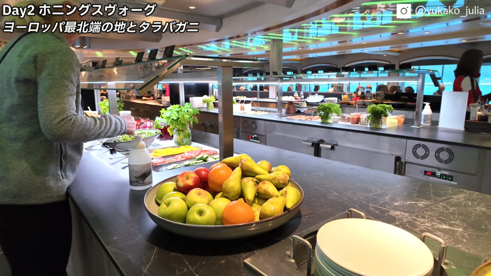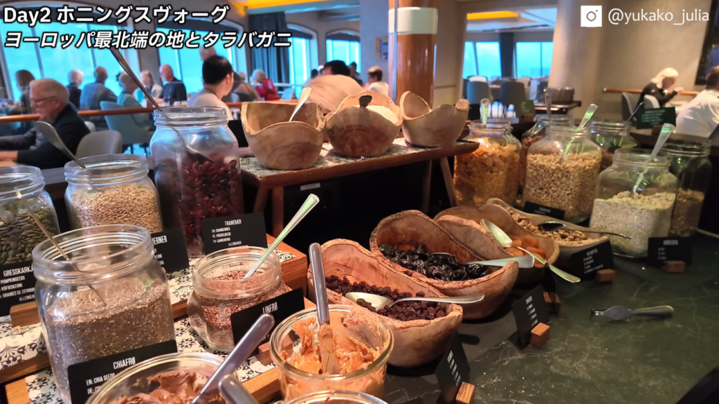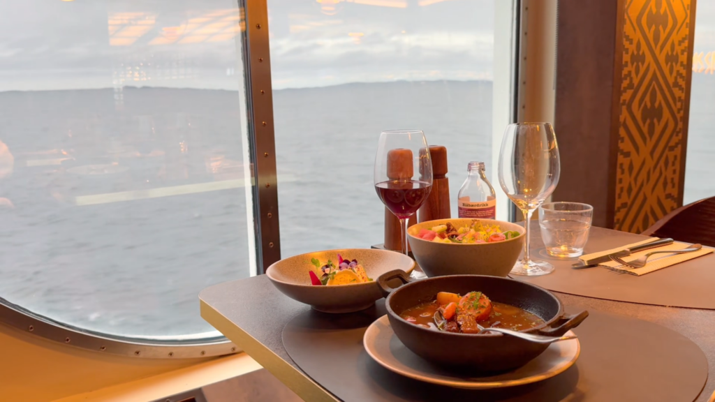 この船の魅力のひとつが、食事のクオリティの高さです。食材の約80%は地元の生産者から調達されており、ノルウェーの豊かな食文化が皿の上に表れています。