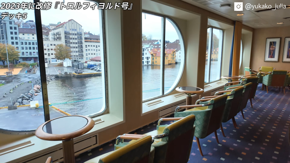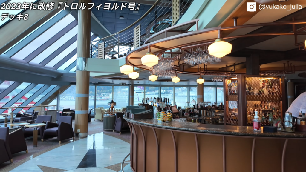 船内には2層吹き抜けのパノラマラウンジがあり、壁一面の大窓からフィヨルドの絶景を眺めながらゆったりと過ごすことができます。