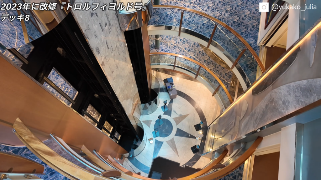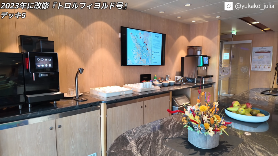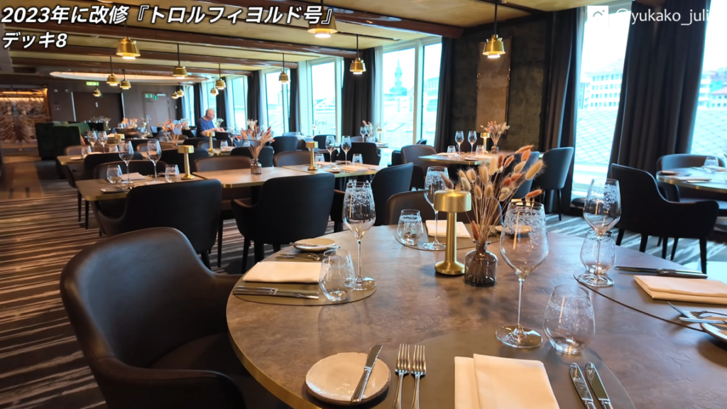 今回利用した「シグネチャー・ボヤージュ」は、通常の定期便(沿岸急行船)と異なり、オールインクルーシブで各寄港地をじっくり巡る観光特化型のプレミアムプランです。「移動手段」ではなく「旅そのものが目的」として設計されており、食事・ドリンク・Wi-Fiがすべて料金に含まれています。ジムやサウナも完備しています。