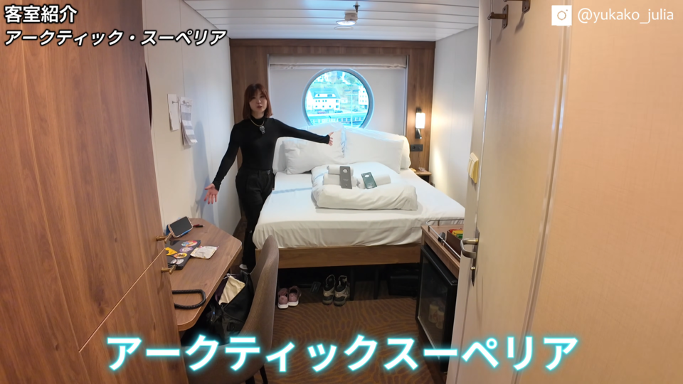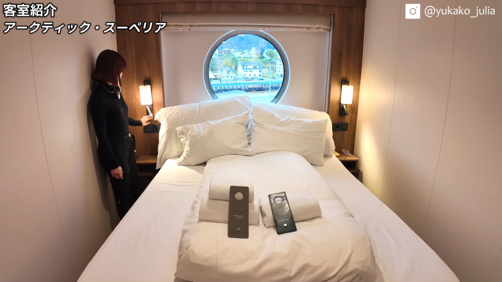今回宿泊したのは、窓付きのダブルベッドルーム「アークティック・スーペリア(Arctic Superior)」です。船内には270室があり、アークティック・スーペリアはバランスのよい中級グレード。大きな窓からの眺めが素晴らしく、オーロラ観賞にも適した客室です。