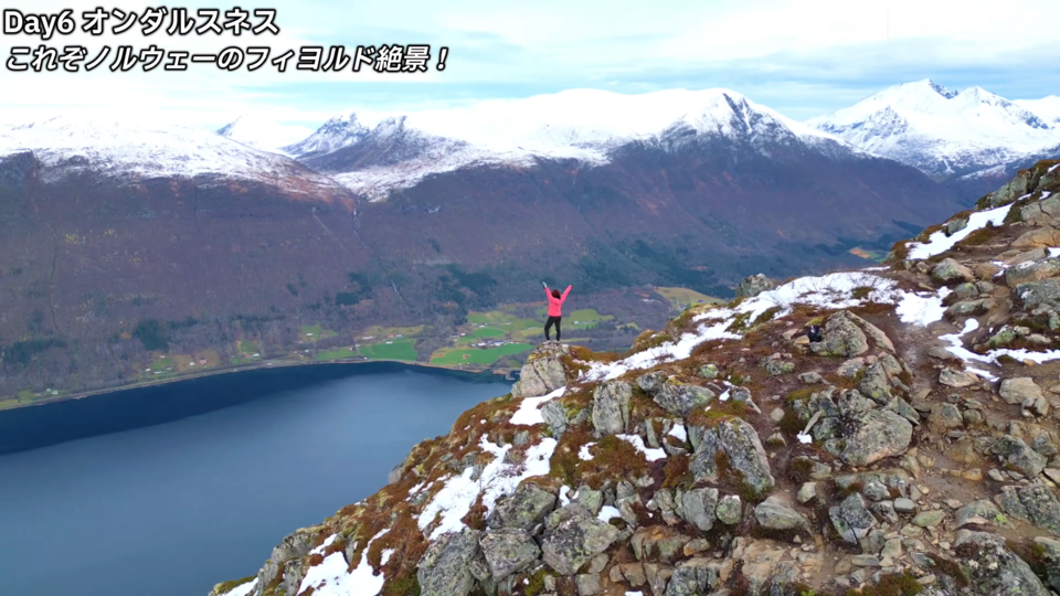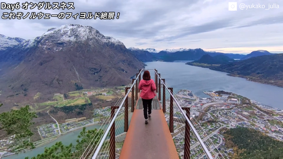 ゴンドラで展望台へ。空中に突き出した展望台「ランペストレーケン」から見下ろすフィヨルドの絶景。秋の紅葉と雪のかかった白い山の絶景パノラマを独占できるお気に入りの場所。