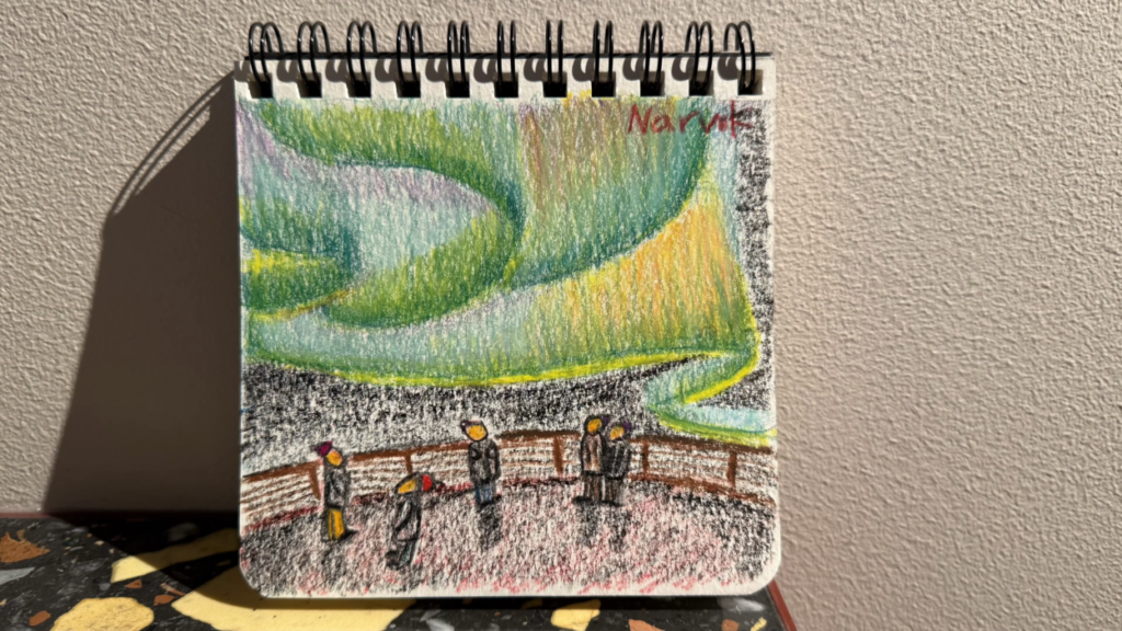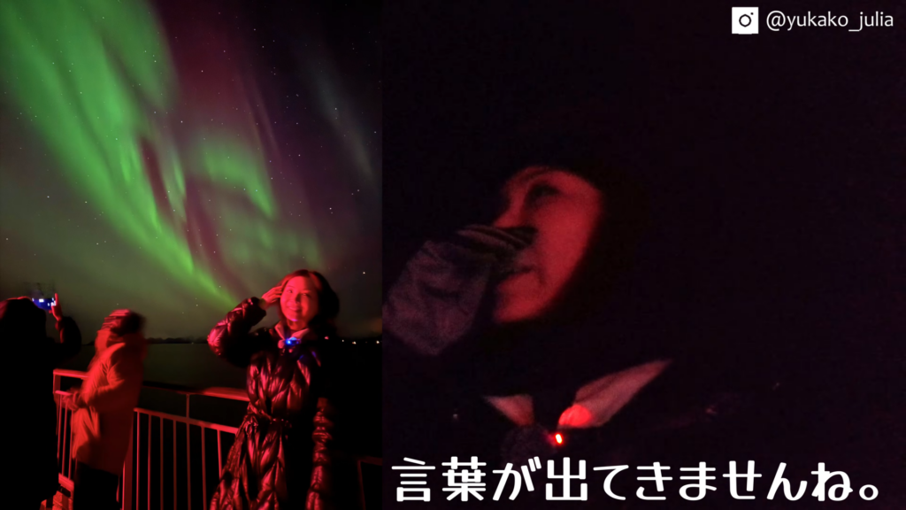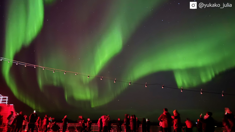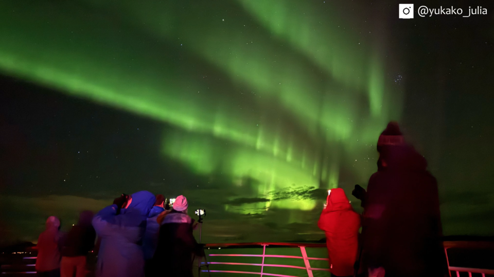 船内アナウンスが響き、デッキへ上がると、そこにはカーテンのように揺らめき、空一面を埋め尽くすオーロラが広がっていました。肉眼でもはっきりと緑やピンクの色が見えるその光景は、言葉では到底伝えきれない美しさでした。デッキに集まった乗客たちと、言葉もなくただ空を見上げていた時間は、一生忘れられないものになりました。