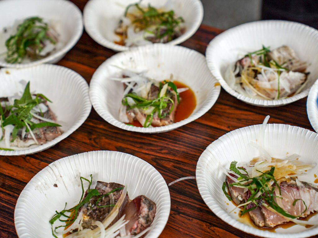 高知といえば、鰹の藁焼きは有名ですがイベントでは鰤の藁焼きたたき実演後、ふるまってくださり美味しい鰤の藁焼きをいただくことができました。