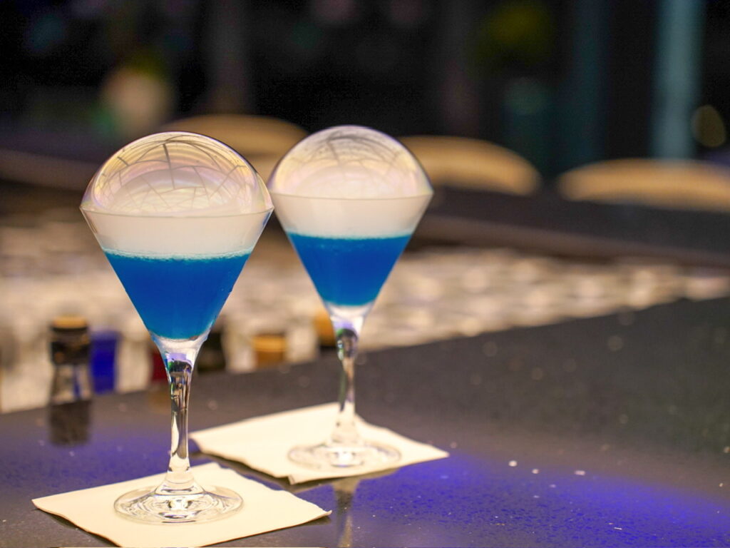 泡がポワンとのっているシグネチャーカクテル アイシーピークマティーニは絶対飲んでほしいカクテルのひとつです。