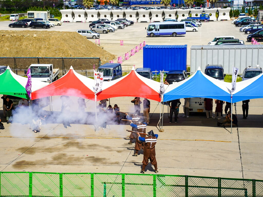 種子島出港のセレモニーは種子島鉄砲太鼓と火縄銃の試射実演を見ながら次の寄港地小松島へ向かいます。