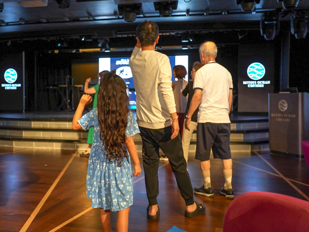 今日は盆踊りのアクティビティに参加。クルーズ9日目に盆踊り大会があるので娘も一緒に踊れるように練習しました。