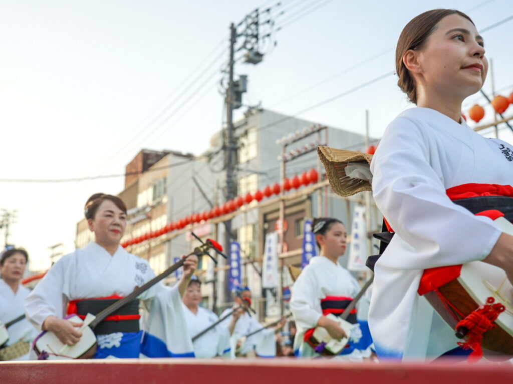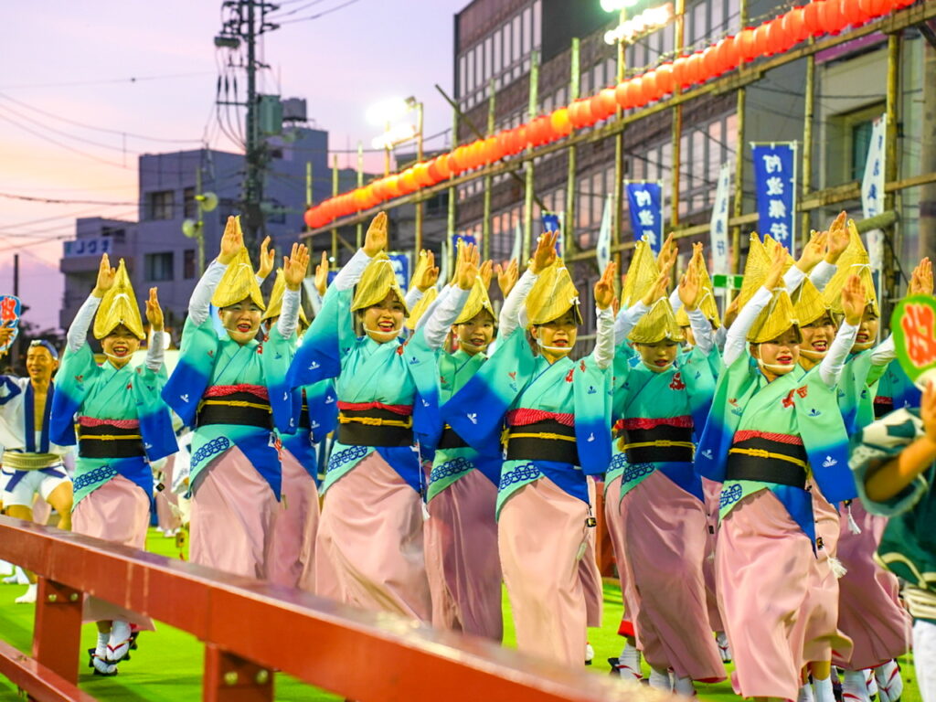 高知のよさこい祭りとはまた違った独特のリズムと掛け声、華やかな衣装で知られています。