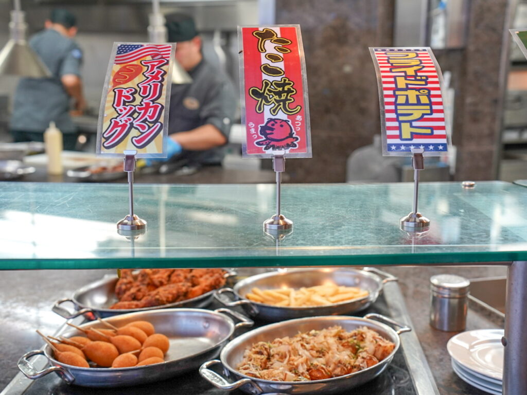 プールレストラン湖畔のメニューはたこ焼きやアメリカンドックなど屋台風のメニューに早替わり。