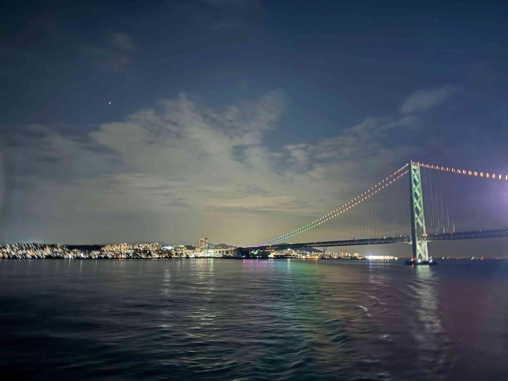 帰りの航路も同じように4つの橋を通過するので、ライトアップした橋や青空にかかる大橋を通過する光景は圧巻です。