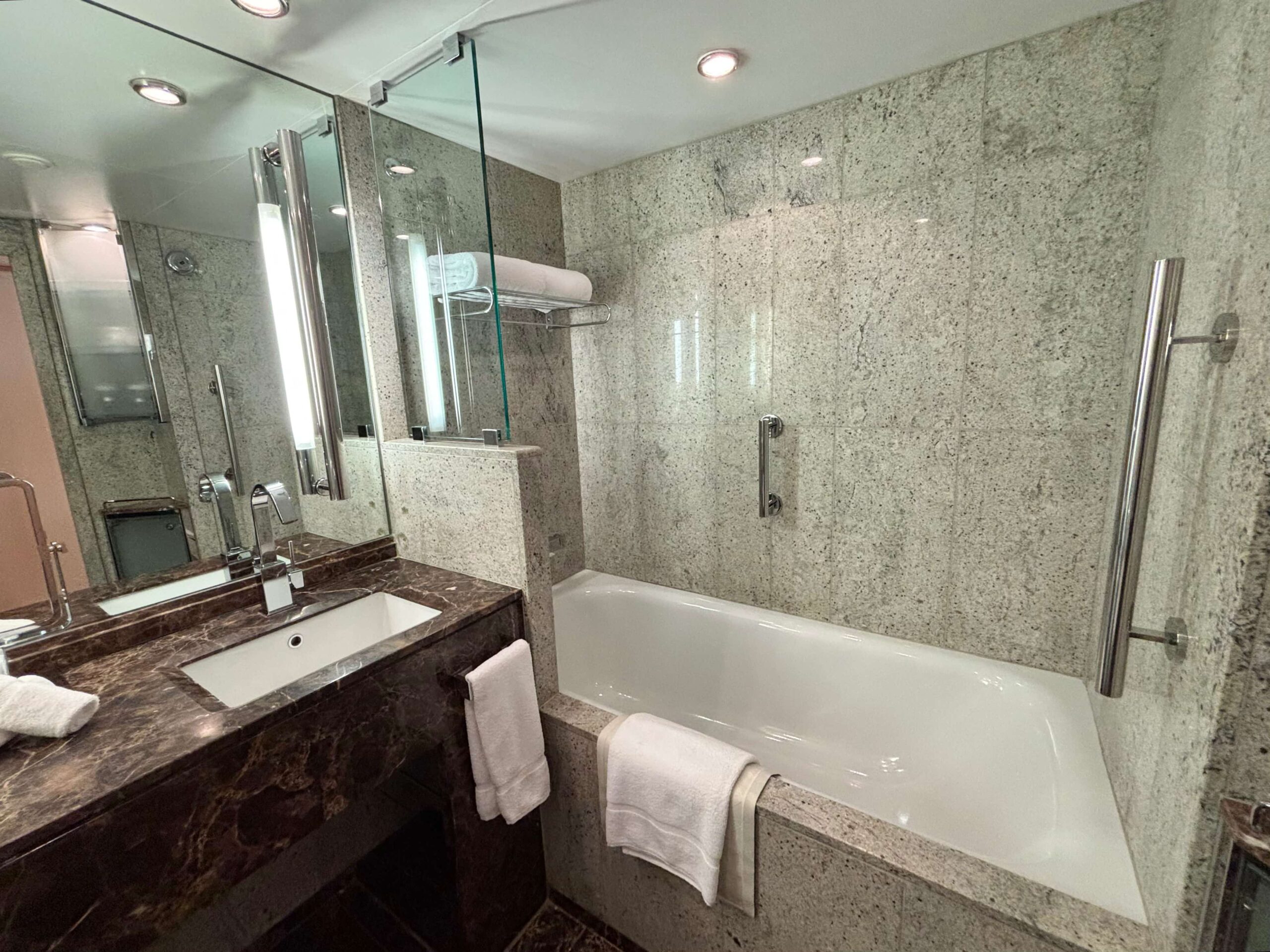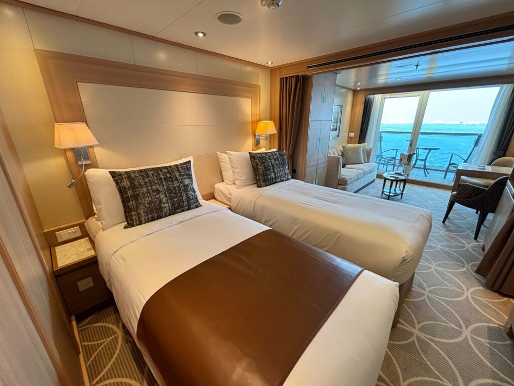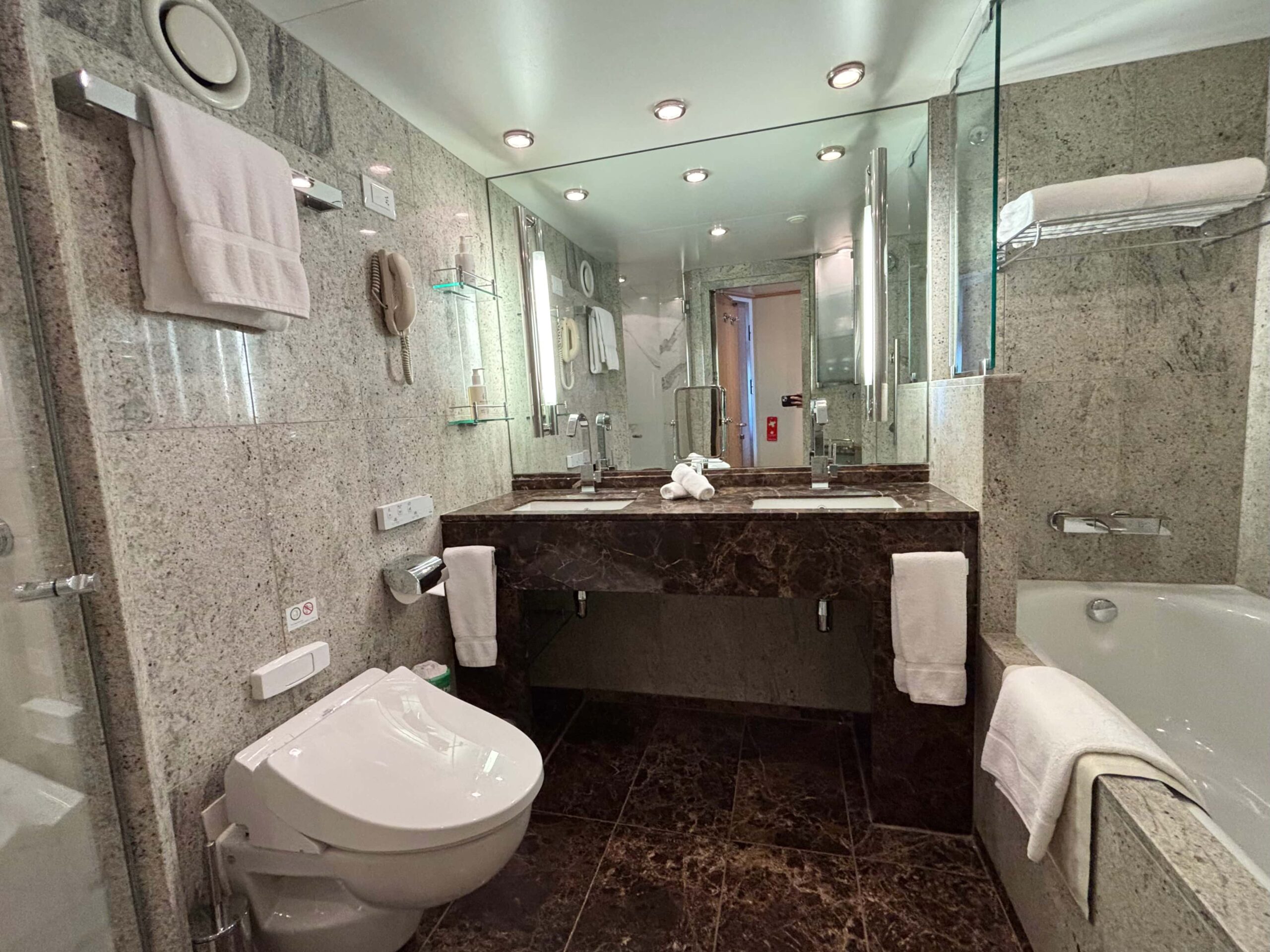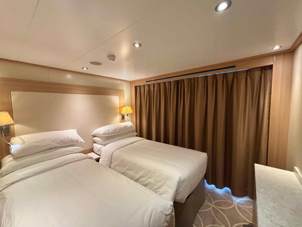さらにリビングとベッドが仕切れる全室スイートタイプで、ウォークインクローゼットとバスタブも全室備わっている徹底ぶり。さすがのラグジュアリー船ということが、客室だけを切り取っても感じられます。