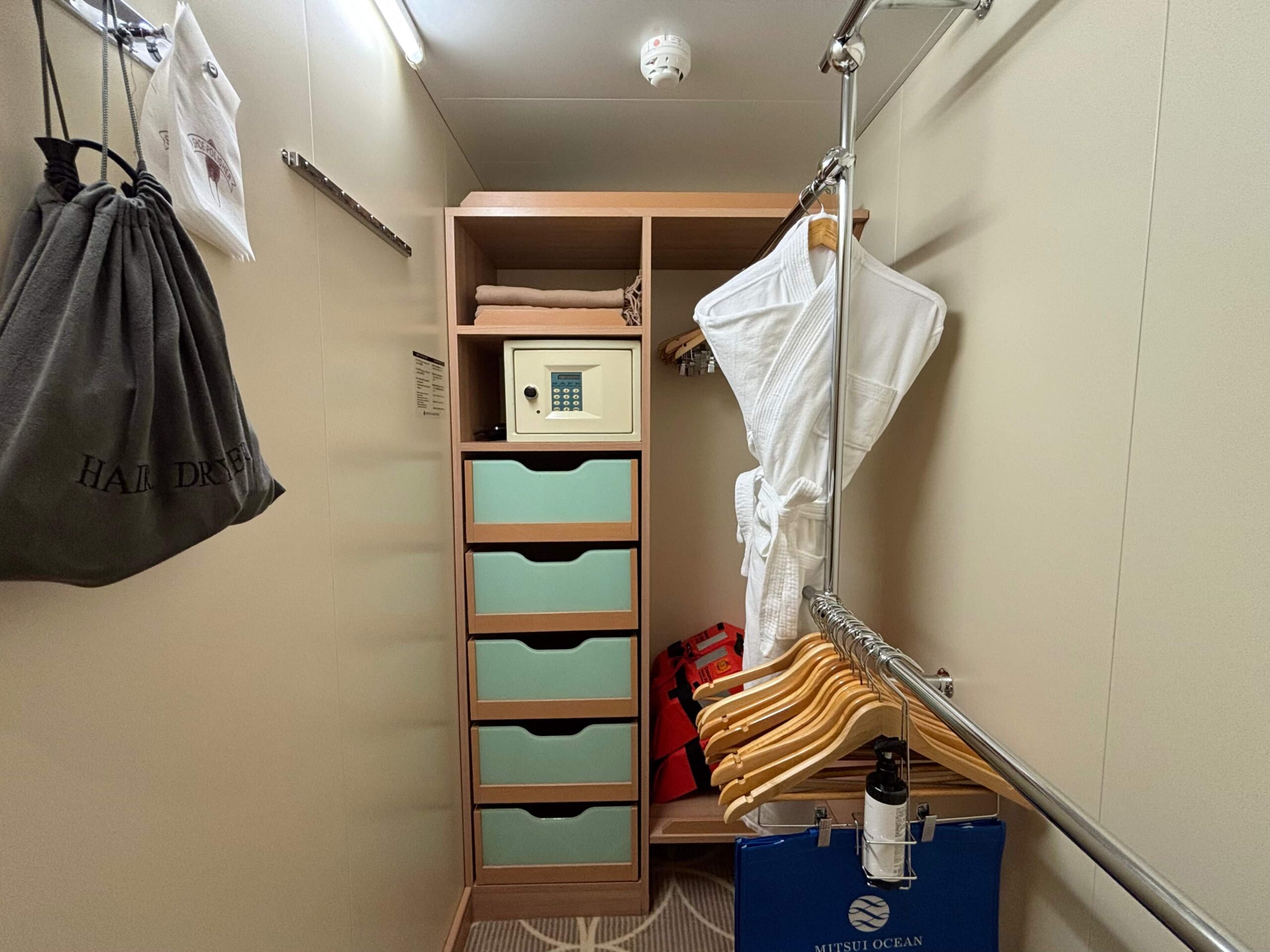 1番嬉しかったのがウォークインクローゼット。せっかくのラグジュアリー船なのでおしゃれしたい方にとっては洋服をたくさん持ってきても十分なスペースが用意されています。ハンガーもたくさんあるのでドレスも数着持ってきてOKです。
