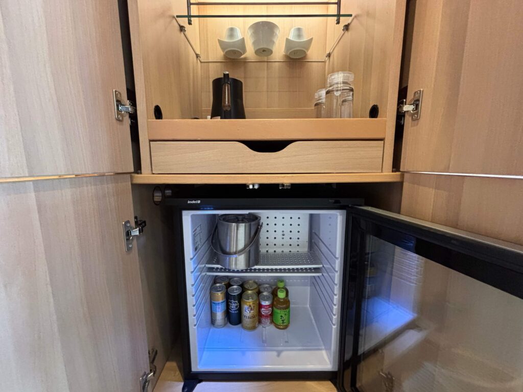 ウェルカムドリンクで今回はなんとフルボトルのスパークリングワインが用意されていました。お部屋に入った瞬間に感動です!さらに客室内のミニバーはすべて無料で、利用した分は客室清掃時に補充してくれました。