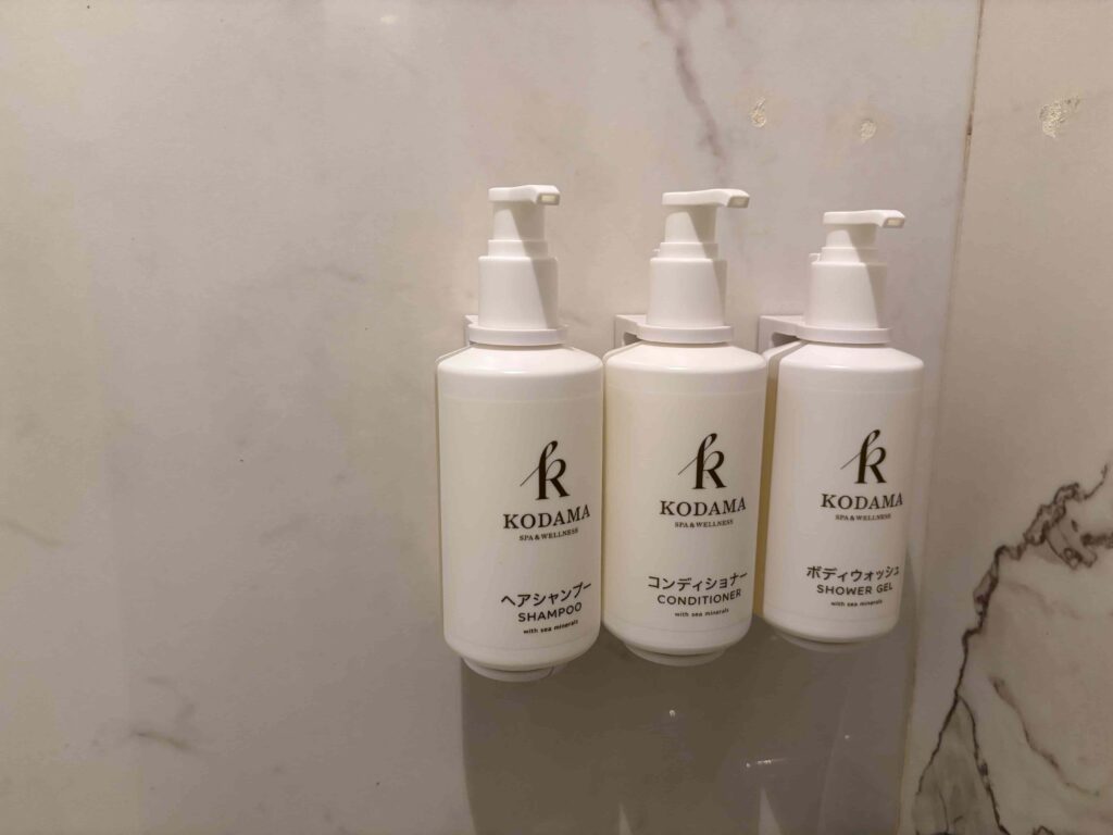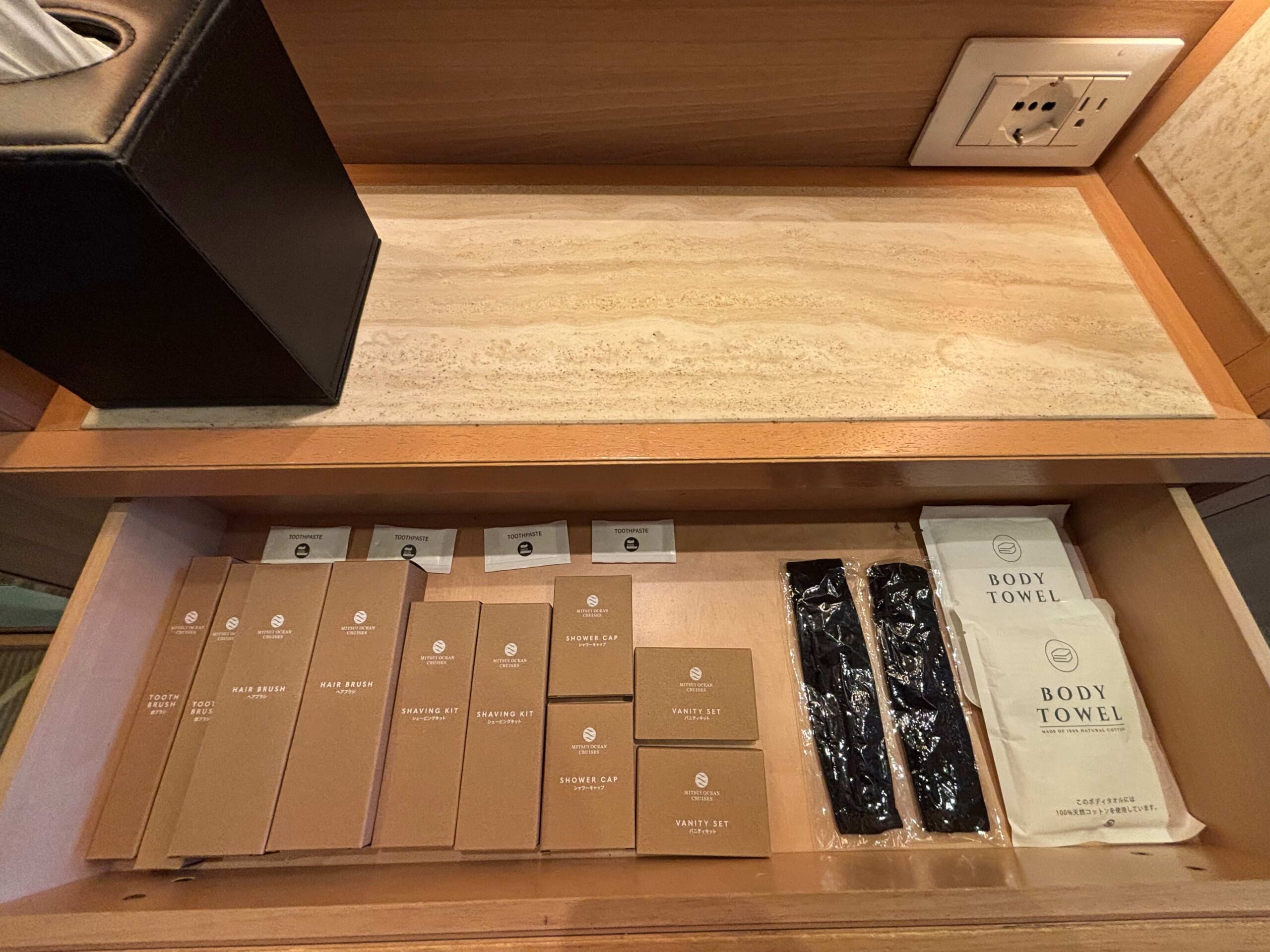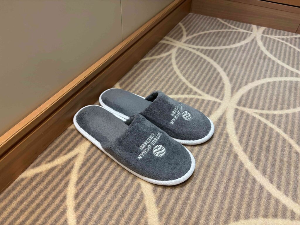 充実したラインナップで、カジュアル船では歯ブラシやシャンプー・ボディーソープも持ち込みますが、船内スパ「KODAMA」ブランドのアメニティが用意されてました。スリッパはふかふかで履き心地抜群です。