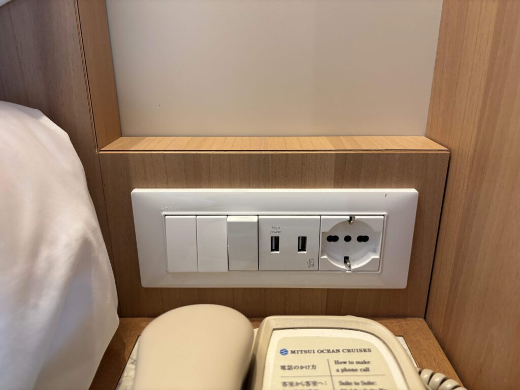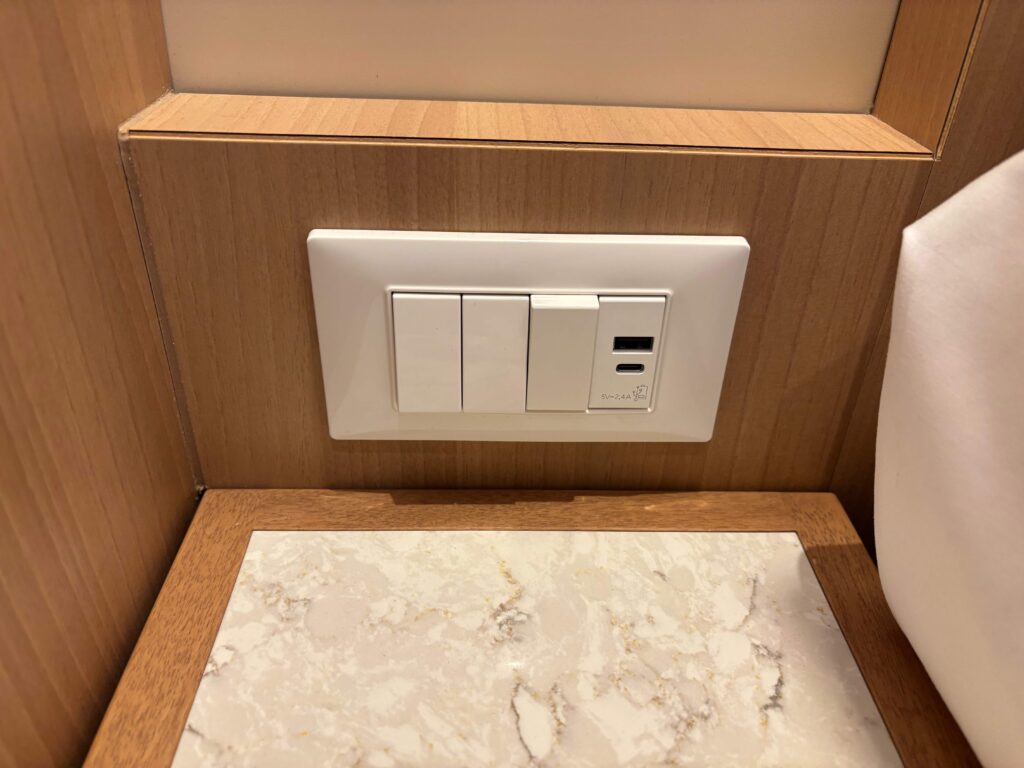 ベッド横のコンセントは海外式になっています。タイプCとUSBタイプもありますが、変換プラグを持参すると良いかもしれません。化粧台は日本式のコンセントなのでドライヤーはここでします。(欲を言えば洗面台に対応コンセントがあると嬉しい!)