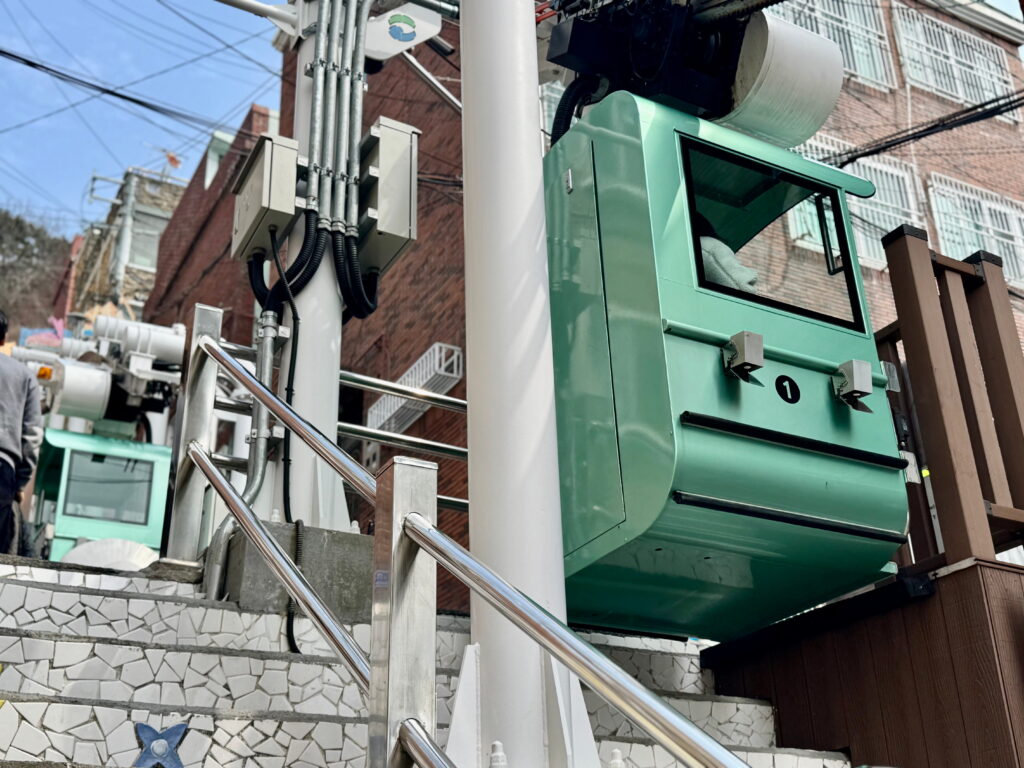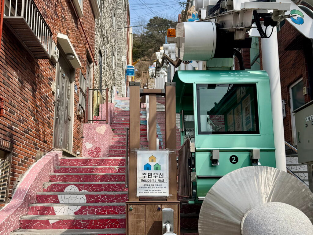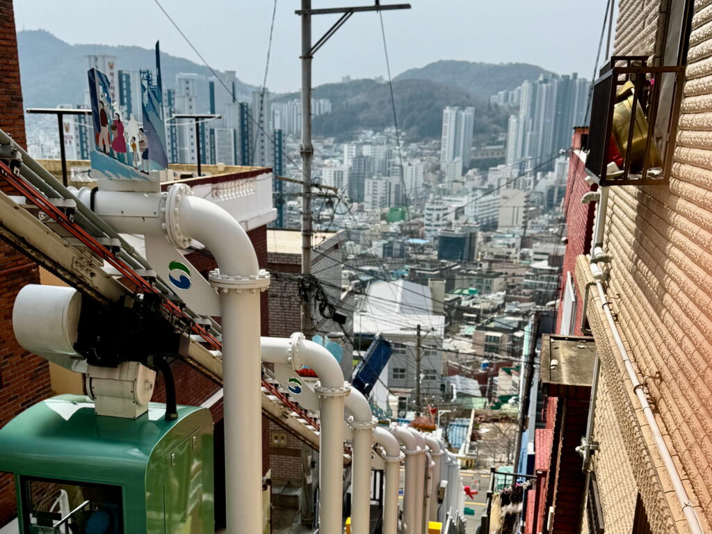 釜山駅からは路線バスに乗り込み、まずは「所望階段(ソマンゲダン)モノレール」と「タッパッコル壁画村」へ。カラフルで可愛らしい壁画が並ぶ路地裏や、急な階段を昇る小さなモノレールなど、まるでドラマのセットに迷い込んだようなレトロで温かい風景に癒されました。頂上から眺める景色も絶景