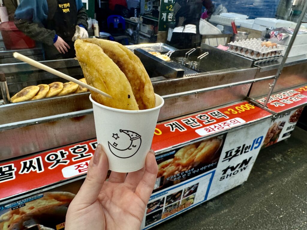 活気ある市場の熱気を感じながら、屋台で本場の熱々「ホットク」をいただきました。ホットクは韓国風おやきで、もち米粉や小麦粉の生地に黒砂糖やシナモン、ナッツを包んで平たく焼いた甘いお菓子。他にも魅力的なお料理がたくさん並んでいましたが、船での楽しみな夕食が待っているので控えめにしました。