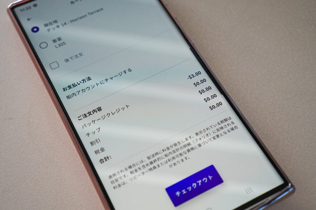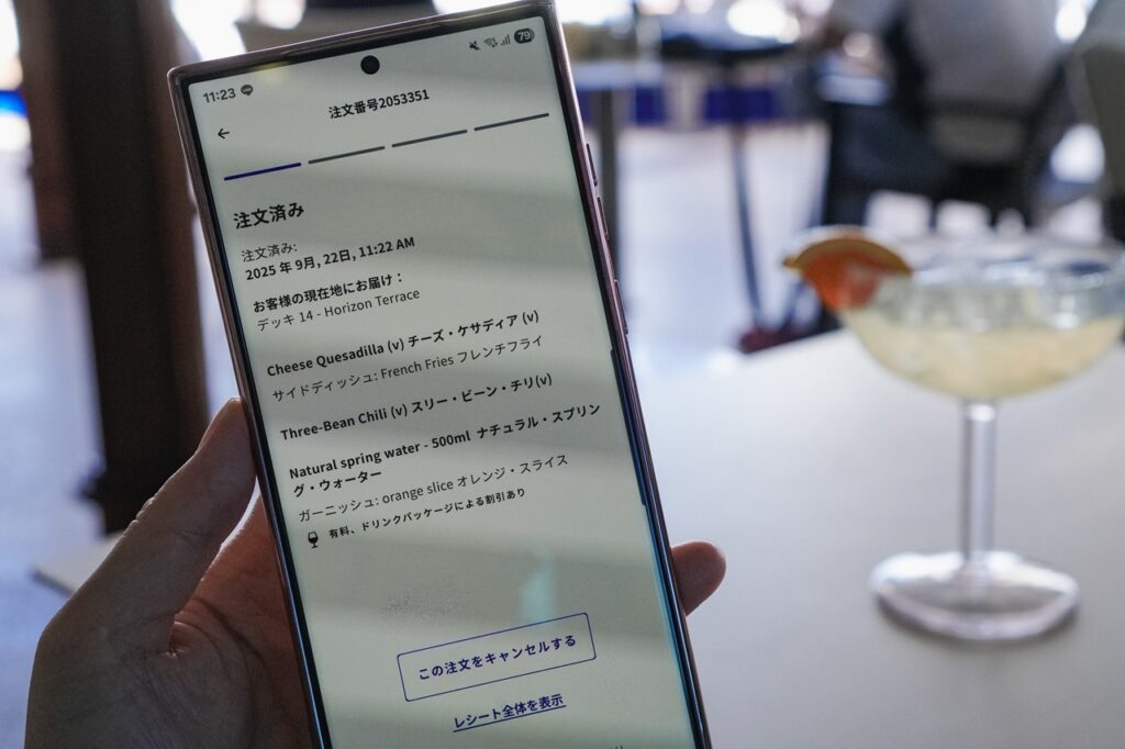 オーシャン・ナウによるデリバリーは、アプリを通じて注文した商品を、客室などを含むどこにでも届けてくれることから、私の場合、船内で定期的によく過ごすエリアがあるので、その場所に届けて貰います。ブッフェの「ホライゾン・コート」まで食事を取りに行くことも無く、自分の時間をうまく活用しながら、タイパ重視で食事を楽にすませたい方にもぴったりです。