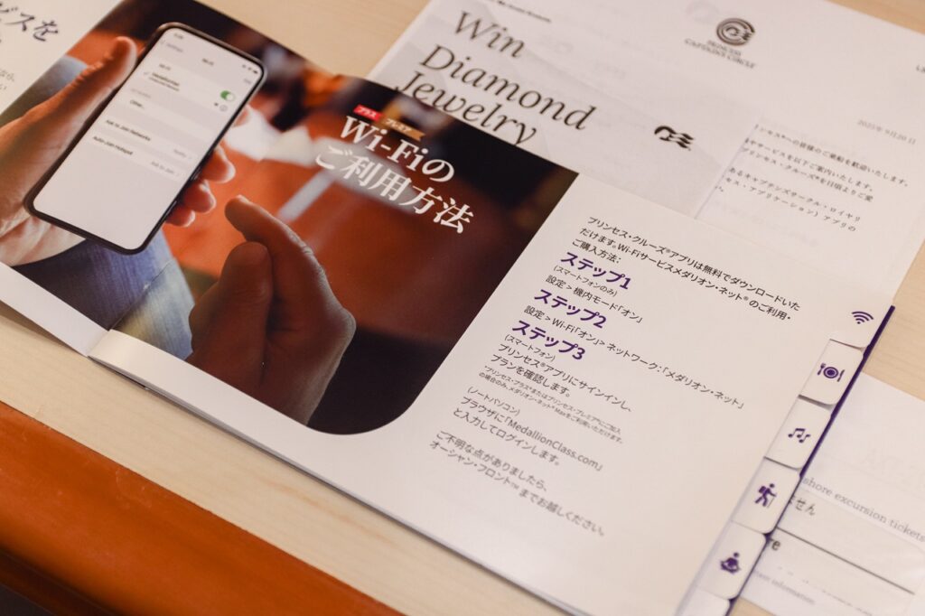 キャビンのデスクにも、Wi-Fiサービス「メダリオン・ネット」の使い方が分かる冊子が用意されいる