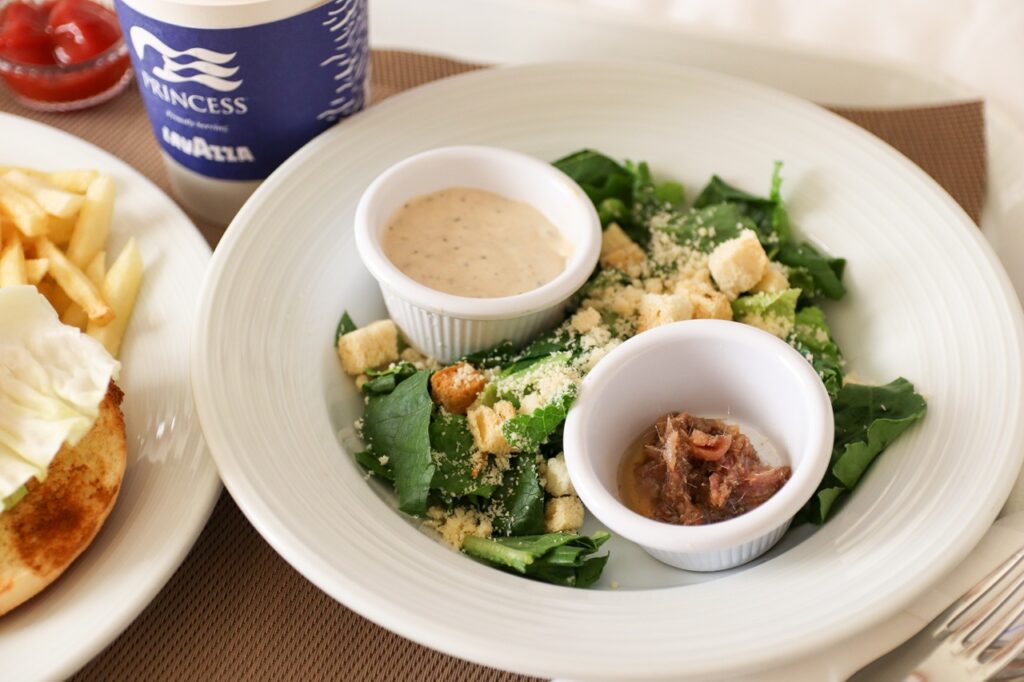 料金プラン「プリンセス・プラス」に申し込んでおいた場合、オーシャン・ナウ利用時のデリバリー料金(14.99米ドル)も含まれていることから、追加料金を気にせず、複数種類ある無料のサラダなどを、日替わりでいただいてました。