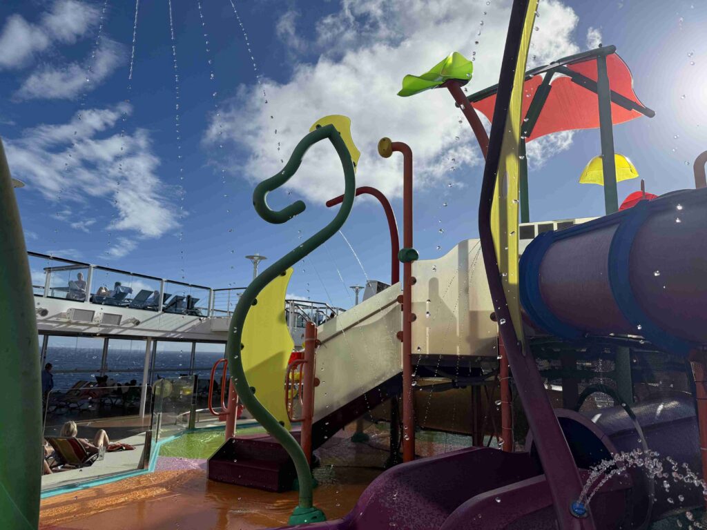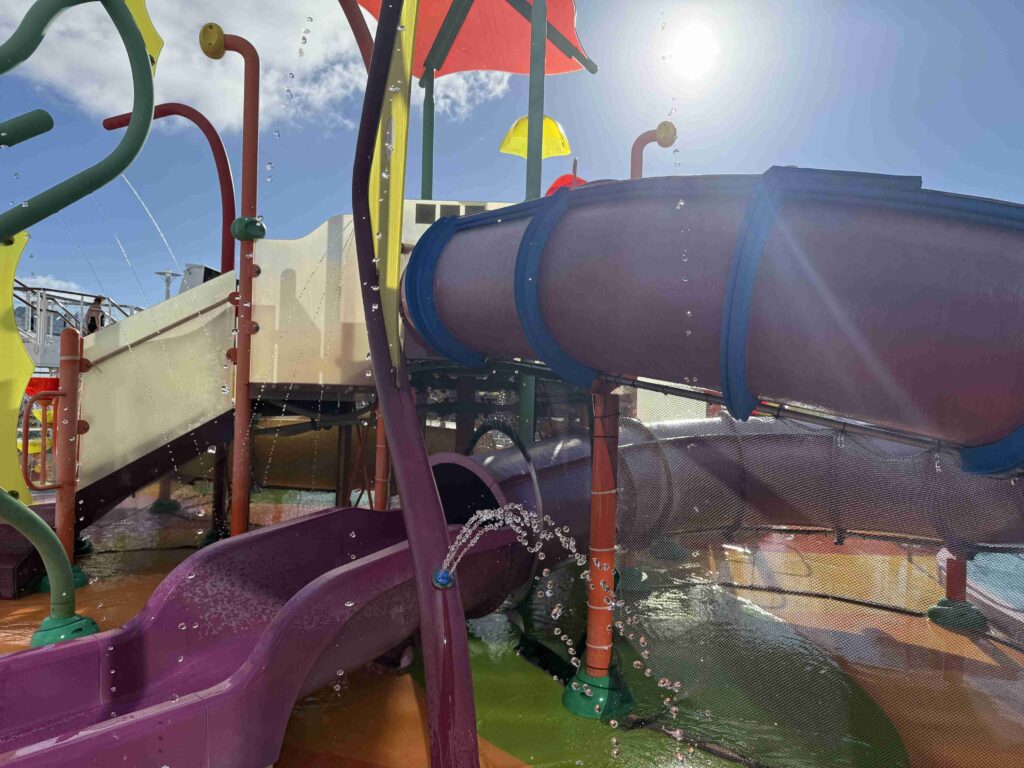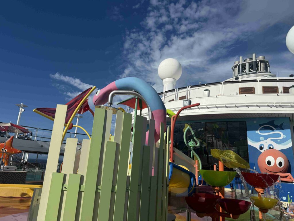 デッキ14のプールエリアは、ファミリークルーズのハイライトです。メインプールは浅いエリアもあり、小さな子どもも安全に水遊びを楽しめます。幼児用の水遊びエリア「スプラッシュアウェイ・ベイ」には、小さなスライドや水鉄砲があり、未就学児に大人気です。各プールエリアには、スタッフさんが見守ってくれており、安心でした。ちなみにプールサイドには、大人サイズ・子どもサイズのライフジャケットも完備されていて、無料でレンタル可能です。
