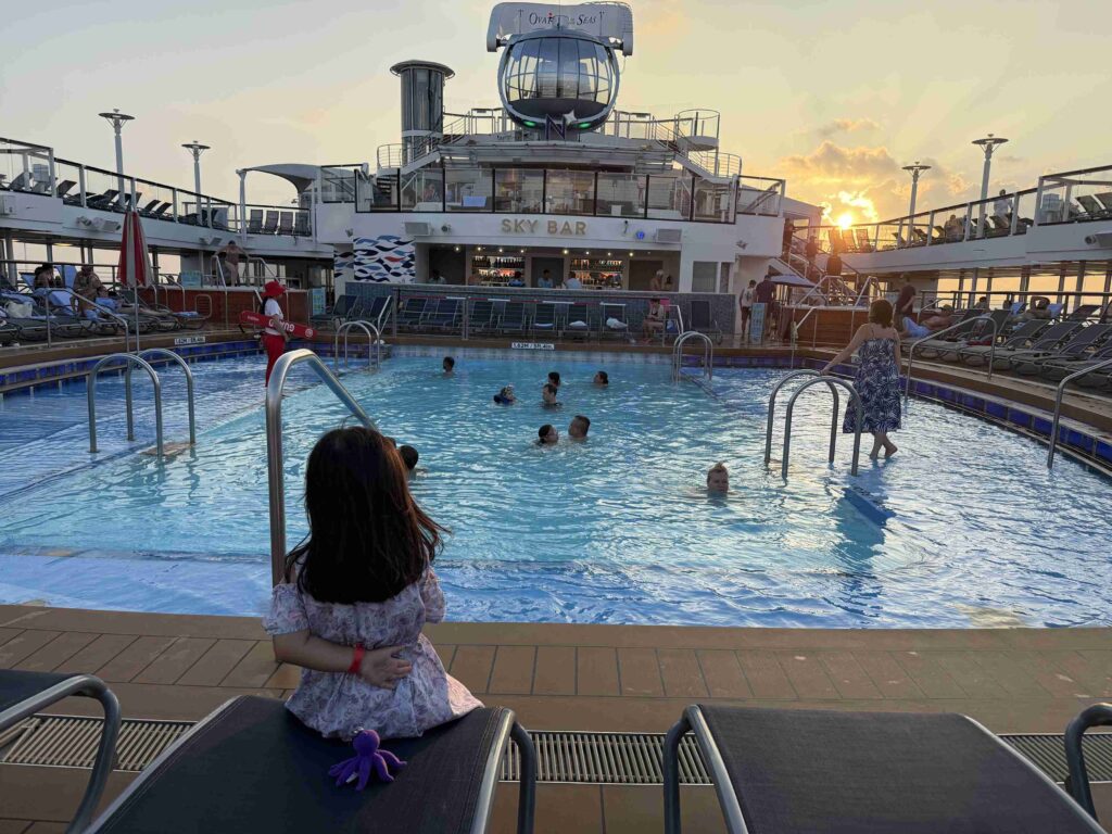さらにグルグルと水流で流されるような円形のプールも、とっても面白い。クルーズ船で流れるプールに入れるなんて驚きです。娘はライフジャケットに身を任せ、背泳ぎのような体制でグルグルと回るのにハマって、何度も入りました!