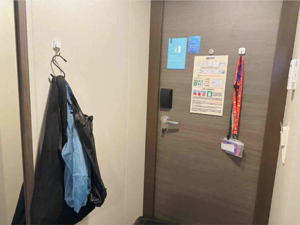 乗船後はまず客室へ向かいます。荷物はしばらくしてから客室前に届けられるため、すぐに荷物整理ができるわけではありません。