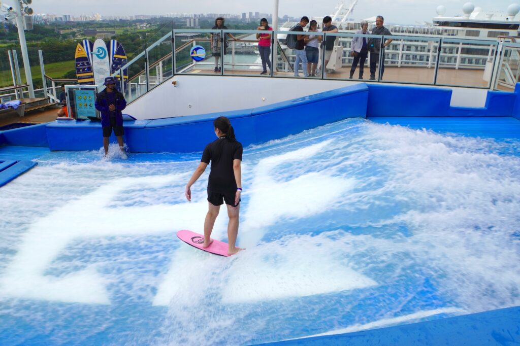 同じく長蛇の列ができていたのが大人気のFlowRider(サーフィン)です。船の上でサーフィンができるとは、すごすぎる!The Keyではアクティビティの優先時間があるのでゴーカートとサーフィンを絶対に挑戦したい人にはThe Keyは向いているかもしれません。