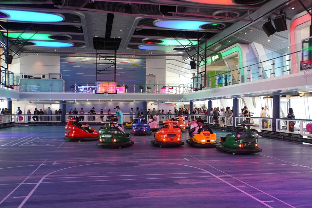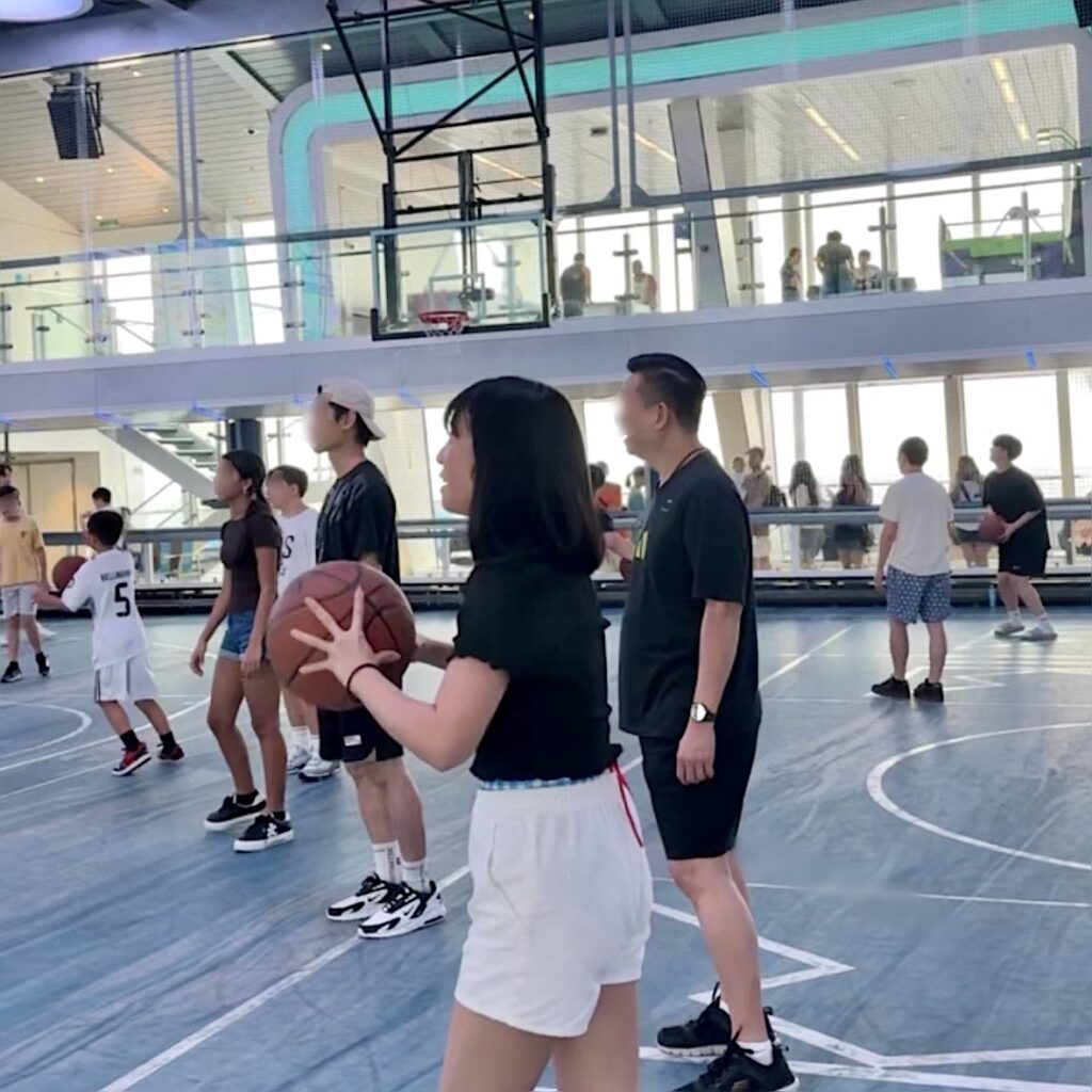 驚いたのが船の上に室内スポーツアリーナ(Seaplex)があることです。ここではバスケットボールやサッカー、バトミントンなどが時間帯によって楽しめます。実は普段からバスケをする私。バスケットボールの時間帯に訪れて少しシューティングに参加してみました。ボールはみんなでシェアするのでガツガツやるというより、ボールをみんなでまわしながらシュートをしていき、その場で友達ができそうな雰囲気です。船内でカラダを動かせて、子供達に大人気のエリアです。