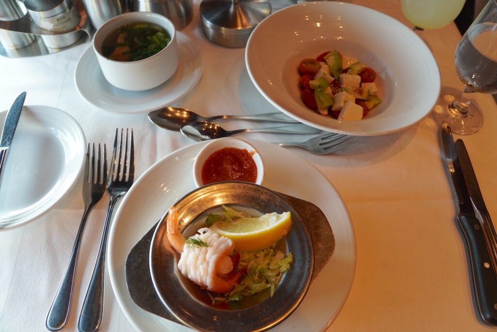 私たちのディナー会場は、赤い壁や椅子が印象的な高級感あるメインダイニング。今回は、時間指定のあるファースト・セカンドシーティングではなく、営業時間内であれば好きなタイミングで訪れることができる「MY TIME」を利用しました。ここでは前菜、メイン、デザートとコース料理が食べられるのですが、何品頼んでもいいという贅沢さ。お腹がいっぱいの時は前菜をスキップなど自分で選べるのもいいです。