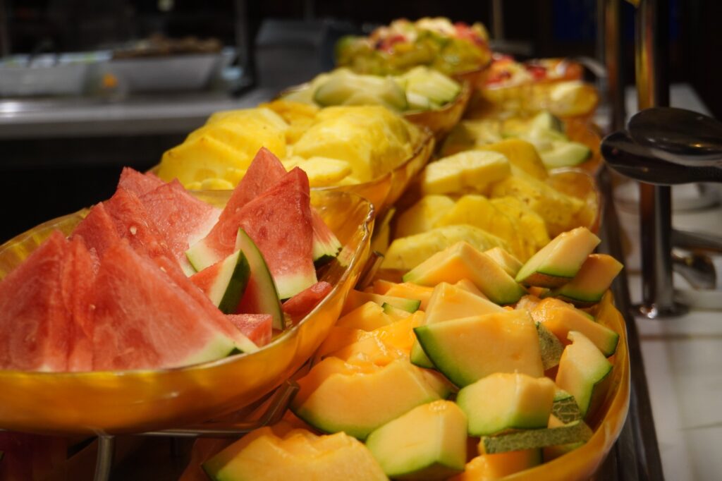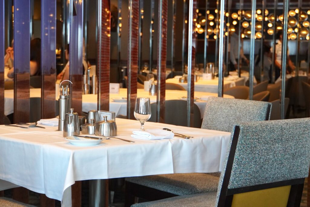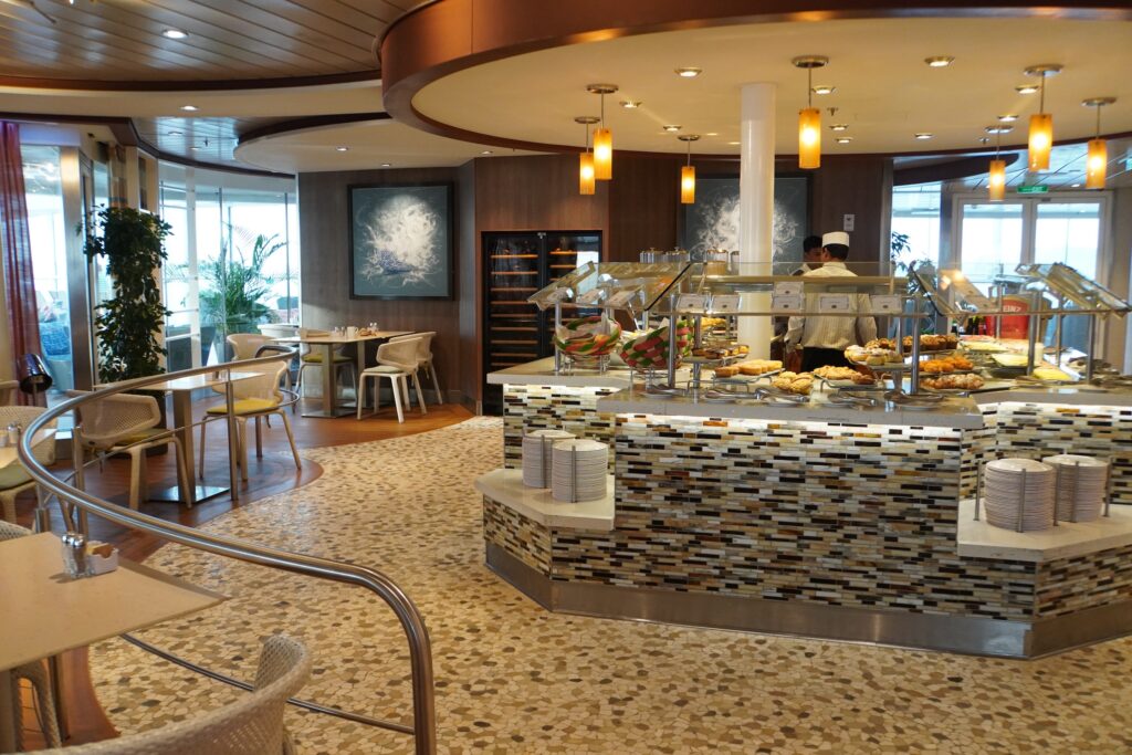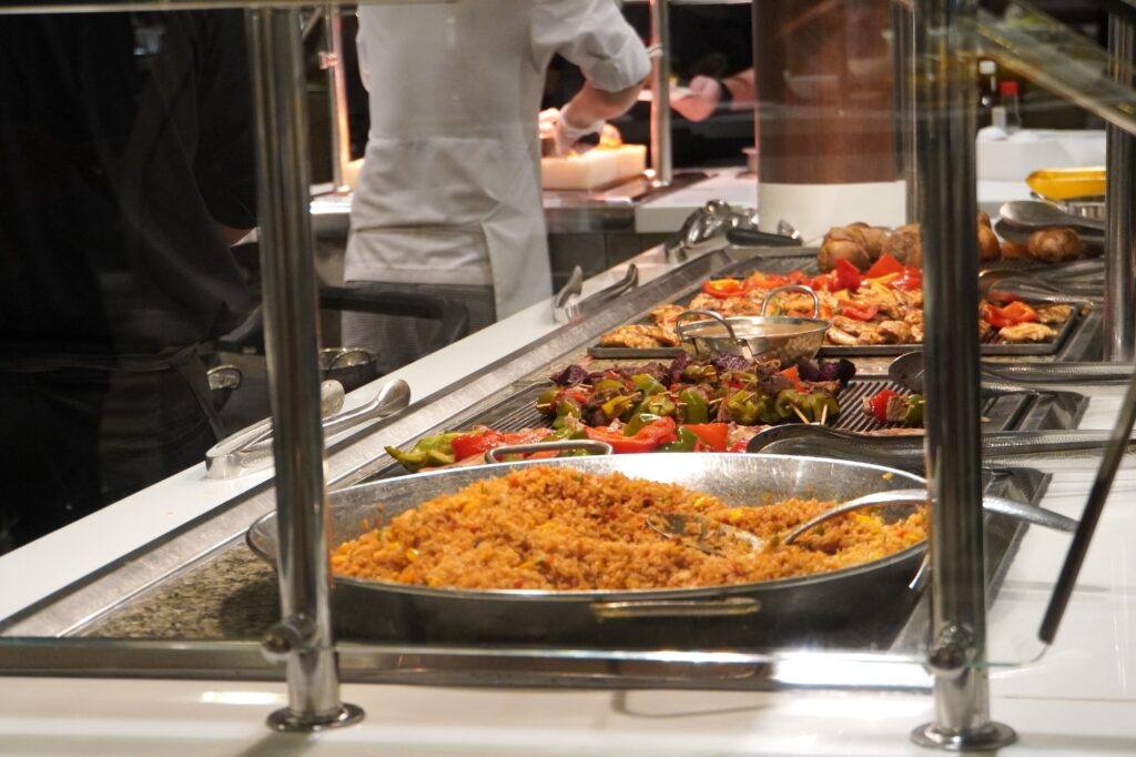 楽しみの一つ、グルメはコース料理が食べられるレストランからビュッフェレストランと豊富な選択肢があり、お好みで選べます。ディナーのメインレストランはいくつかあり、それぞれ場所が割り当てられるようで、最初、自分たちがどのレストランなのかわからず困り、戸惑いました。しかしよく見るとルームキーカードに記載されていたので、そちらを先ずチェックしてくださいね。