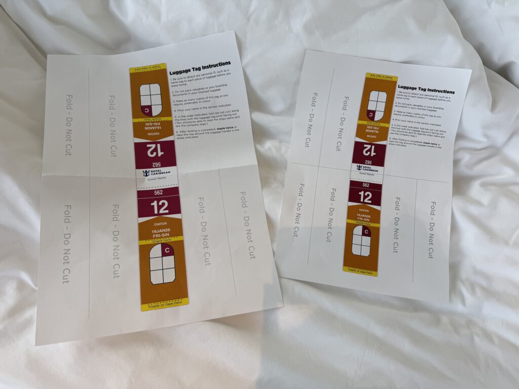 数日前にはアプリ上でチェックイン。準備段階で見逃しがちなのが、ラゲッジタグ(荷物札)の印刷です。これは船に乗船する時にバッグを入り口で預けて部屋に運んでもらう時に必要なので、必ず日本でカラー印刷していってください。A3サイズの方が大きくて使いやすかったです。このタグをつけるのに普段の旅では持ち歩かないホチキスも持参しました。