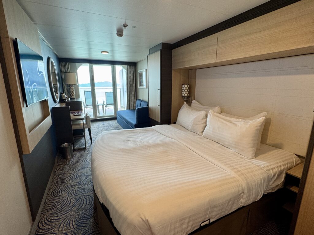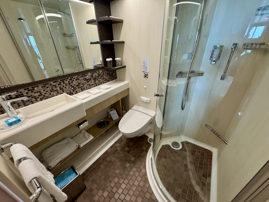 今回の客室は、海側ラージバルコニー付きのツインルーム。乗船後、ルームスチュワードと呼ばれるハウスキーパーにお願いするとベッドを2つに分けてくれます。コンパクトですが、収納も多くて使い勝手がとてもいいです。ホテルのようにスーツケースを広げておくと少し邪魔なので、先ずはクローゼットに必要なものは収納してしまうと船旅が快適になります。