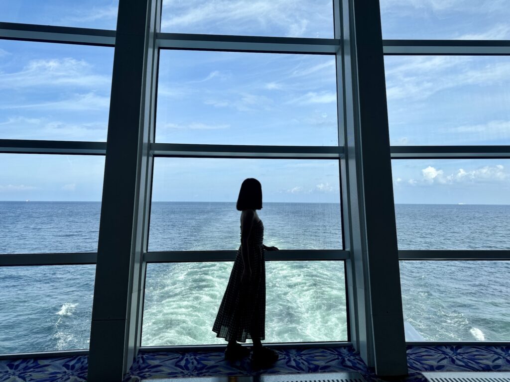 行きは朝日を眺め、帰りは夕陽を見る。街が見えたら街を見渡せるなど、いろいろな景色を楽しめるのも船旅の醍醐味だと感じました。部屋にいる時は、ほとんどの時間をここで過ごしていたので、クルーズに乗るならやはりバルコニー付きのお部屋がおすすめです。