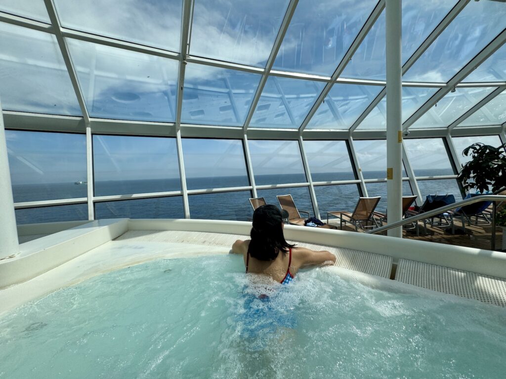 船の先端にあり景色も抜群、比較的静かなエリアでジャグジーもあるので落ち着いて過ごせます。デッキチェアに寝転んでリラックスしたり、ゆっくり語り合いながら過ごしている大人やカップルも多かったです。このエリアに先に伝えたSolarium Bistroがあります。