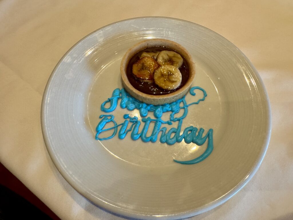 お誕生日などのお祝いも事前にお願いしておくと、デザートプレートとスタッフによる歌をプレゼントしてくれます。今回はバースデーを迎える母との旅だったので私もお願いしておくと、母も大喜び。お祝い事にもピッタリです。写真を撮る際にケーキがずれて文字が潰れてしまったのはご愛嬌。